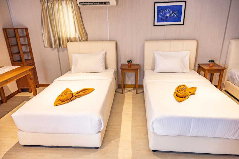 Seaventures Dive Rig offers two comfortable accommodation options: Standard Rooms, ideal for friends or solo travelers sharing, feature twin beds, air conditioning, en suite bathrooms with hot water, free WiFi, and sea views; while Deluxe Rooms provide a more spacious and romantic setting with double beds, private bathrooms, and serene ocean views—perfect for couples seeking added comfort after a full day of diving.