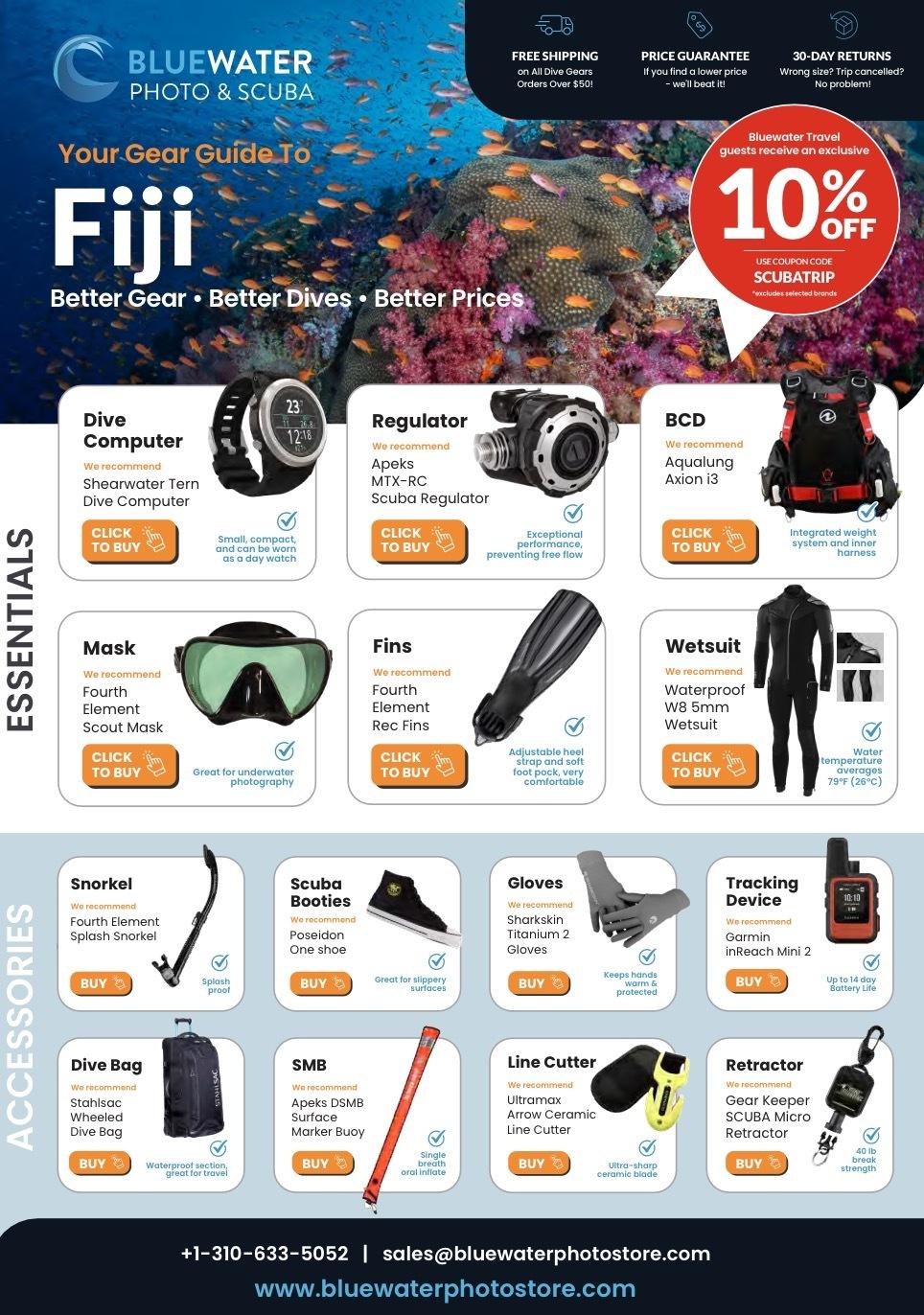 Download our full scuba gear guide to Fiji, Bluewater Travel guests receive 10% OFF! Click the image below to download (PDF).