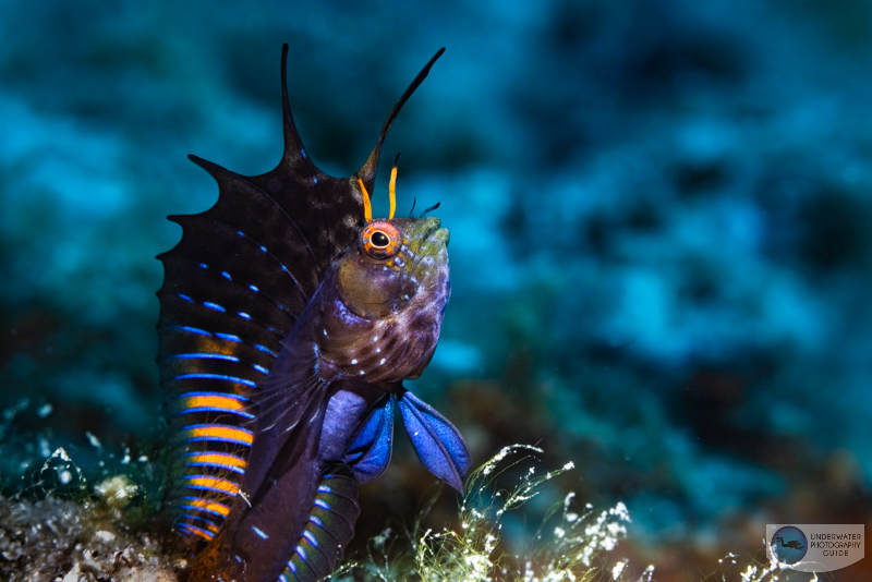 It can be tempting to photograph black signal bennies with a snoot, but it doesn't work - I've tried. It's best to slightly over expose black signal blennies so that you capture the details in their colors and get a nice light background for contrast. A blue background looks nice as well.
